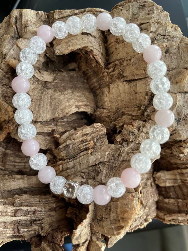 Mooie armband van Cracked kristal en Rozenkwarts. Zo mooi als de zon erop schijnt. De armband is 18 cm